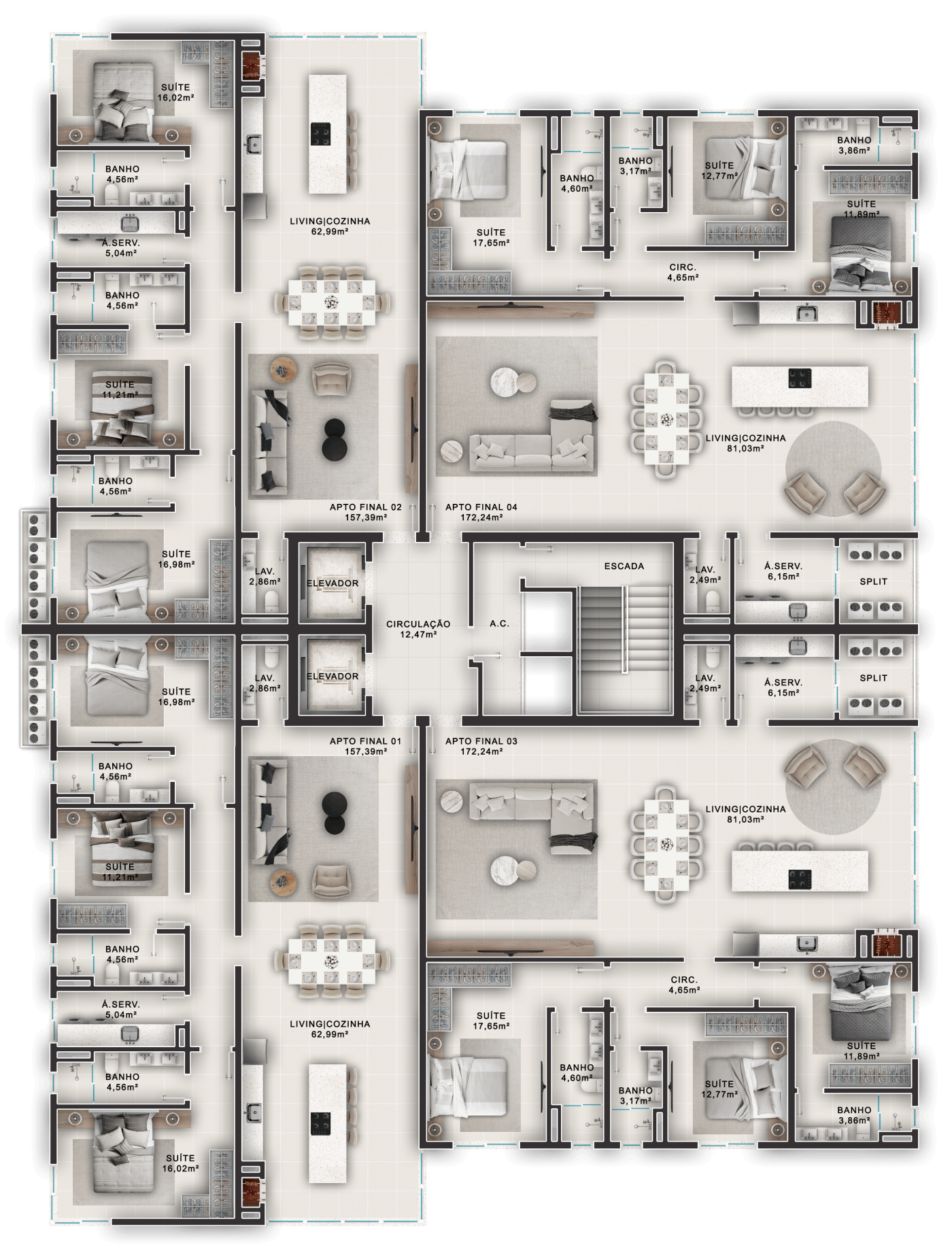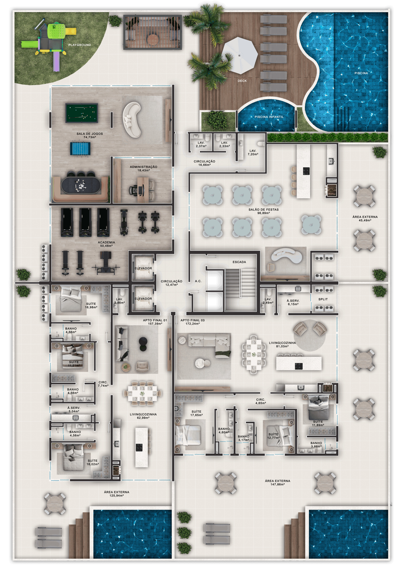 - Apartamentos de 157,39 m² e 172,24 m², com opção de apartamento garden
